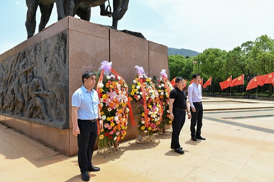 在苏南抗战胜利纪念碑下,胡长征、杨光、徐洪林共同向革命烈士墓和纪念碑敬献花篮,全体党员干部为苏南抗战中牺牲的英烈默哀。